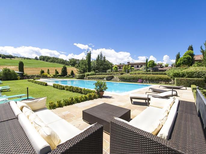 Immersa nel verde giardino e fiancheggiata da una limonaia in vetro, si trova infine la grande piscina con vasca idromassaggio, angolo di relax esclusivo che offre la vista della vallata dalla cima delle nostre colline.